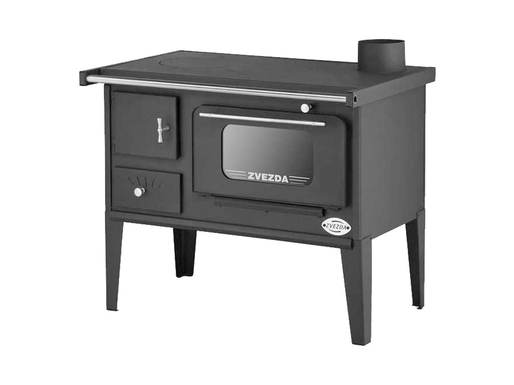 Oceľový sporák na tuhé palivo s liatinovým roštom a šamotovým ohniskom.